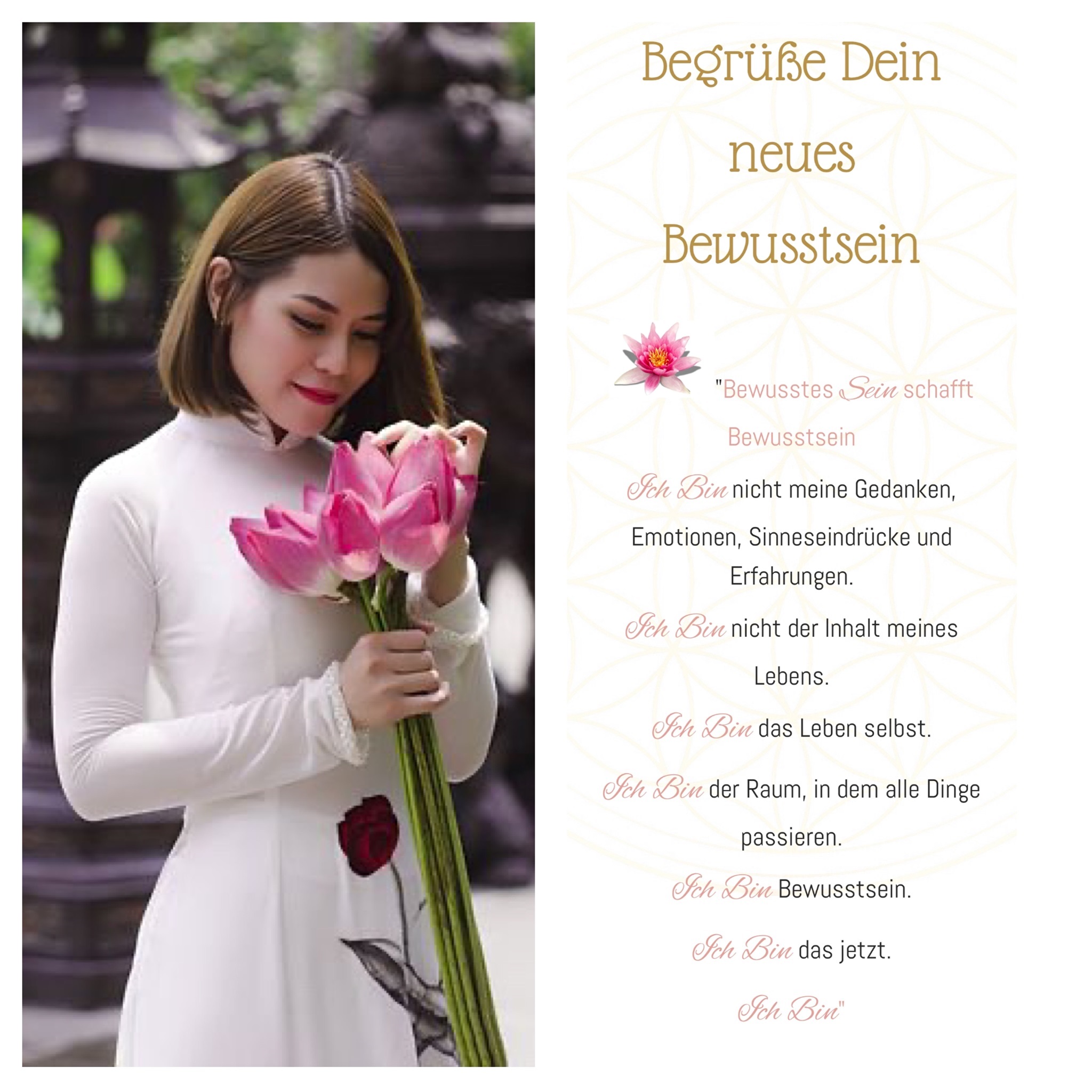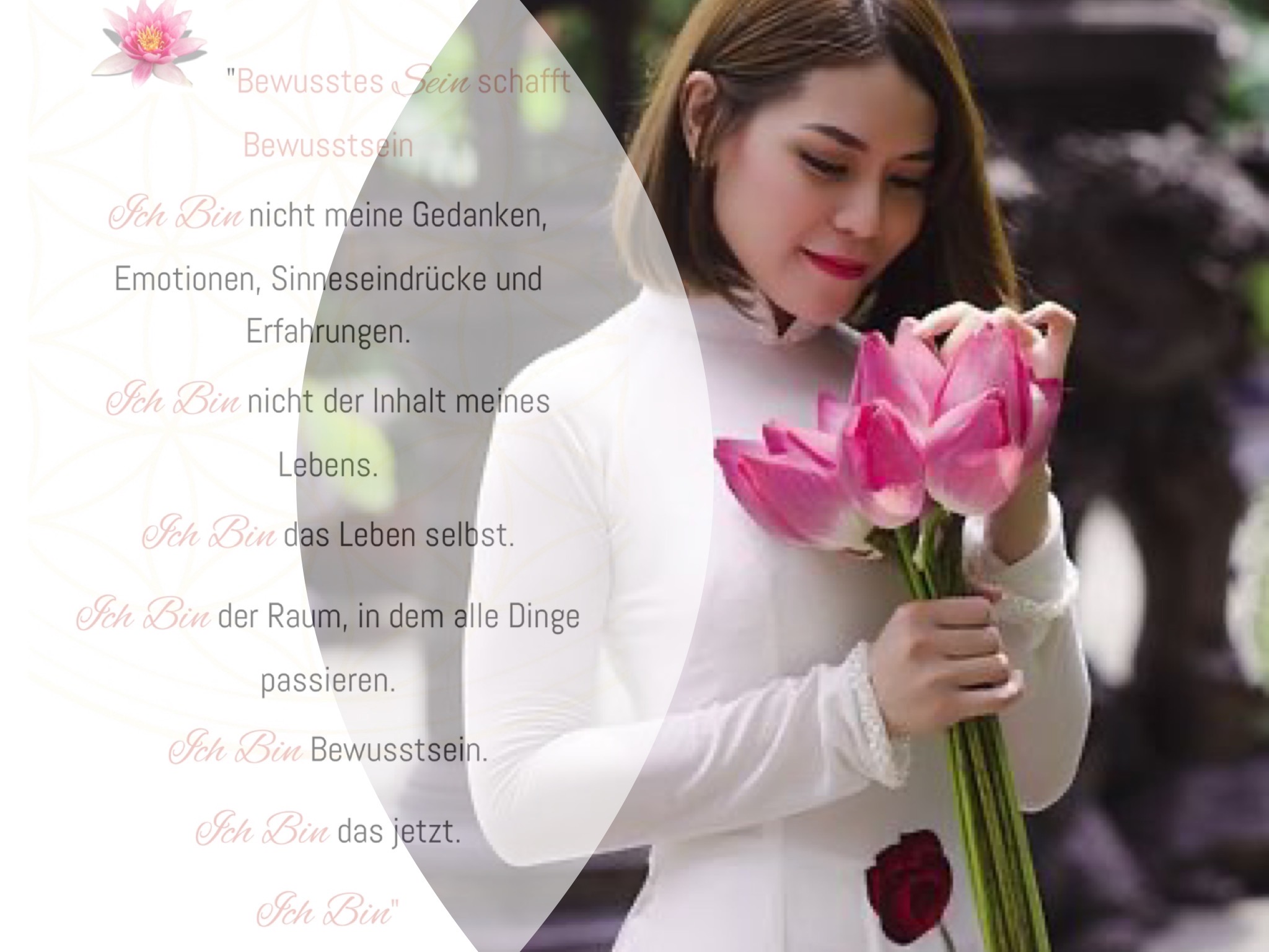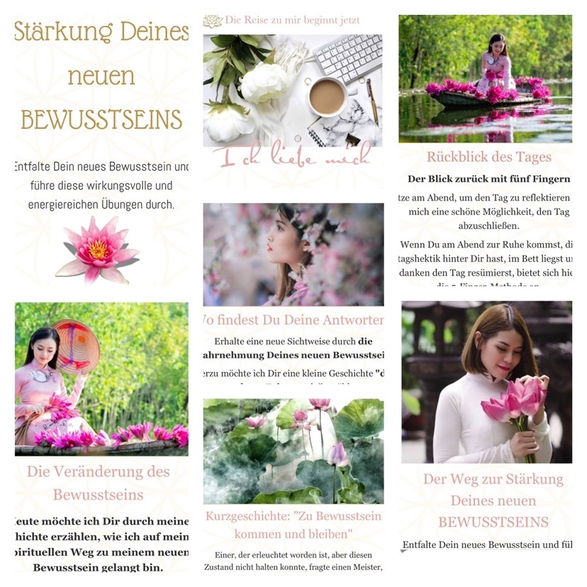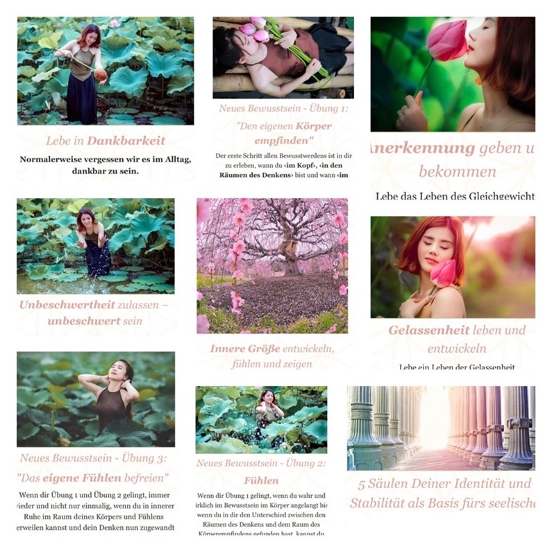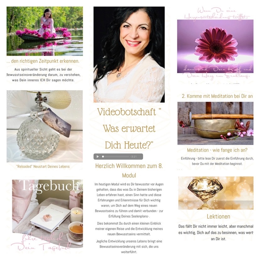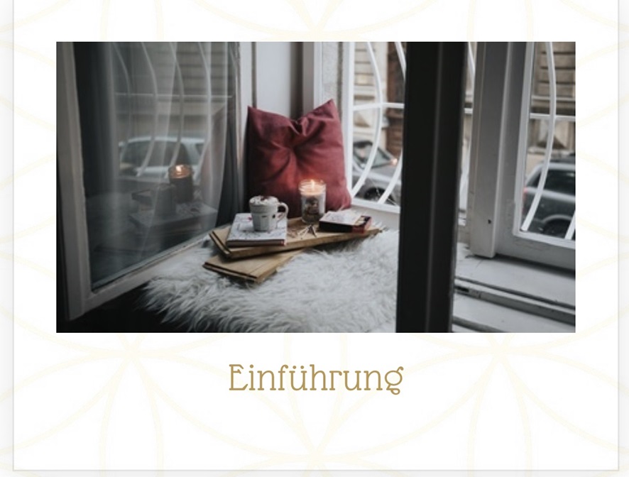 In den Lektionen erhältst Du dann einen praktischen Teil des Themas erklärt, Fragen des Lebens, praktische Übungen, die Dich Schritt für Schritt in Deinem Bewusstseinsprozess begleiten, Affirmationen oder Kurzgeschichten und eine Übung für die Reflexion – Rückblick des Tages durch die Fünf-Finger-Methode